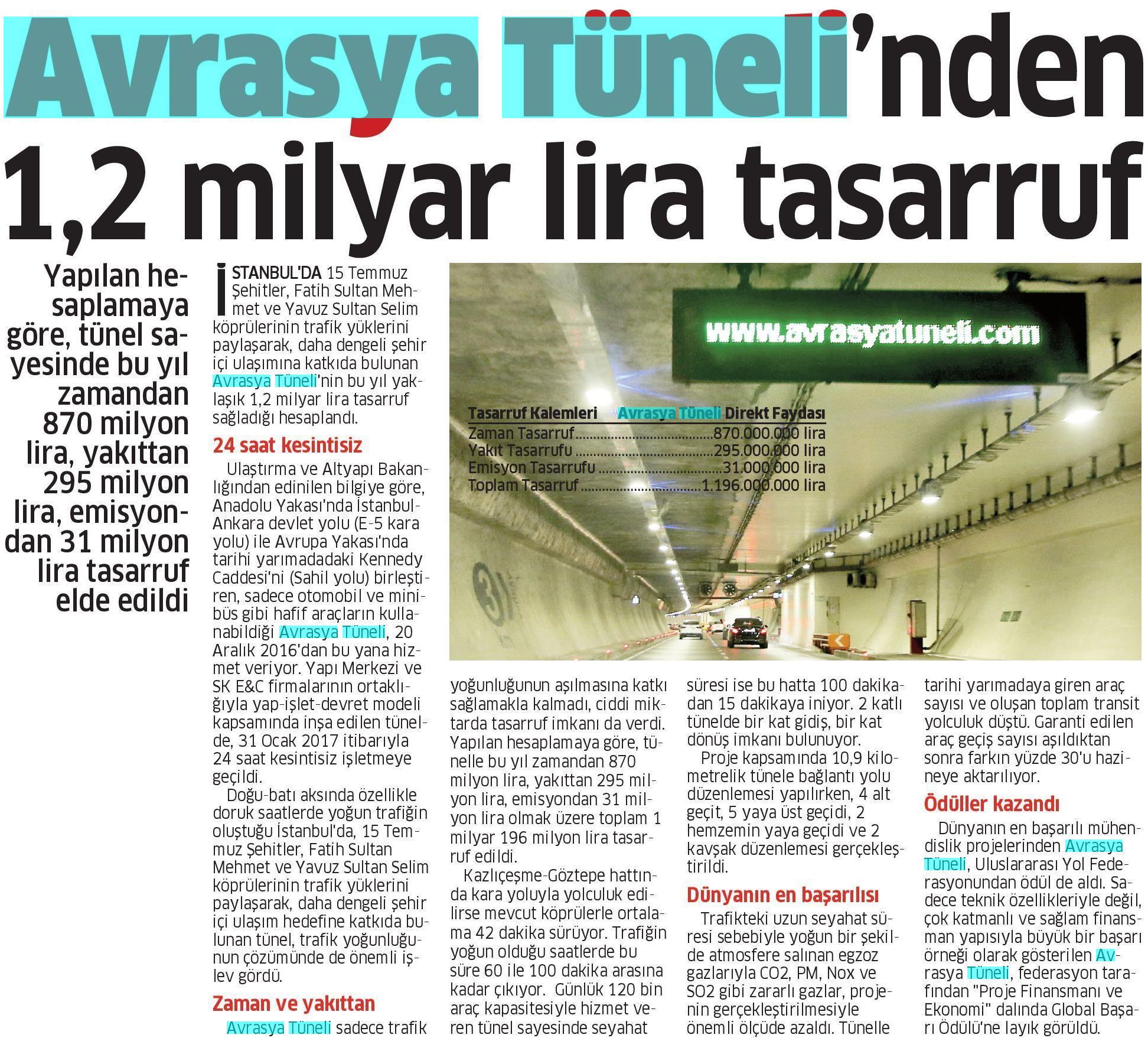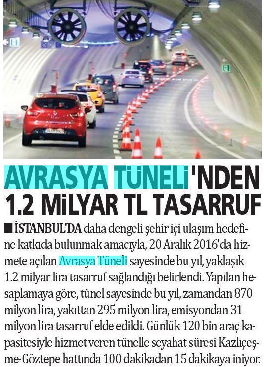 Avrasya Tüneli'nden 1,2 milyar lira tasarruf